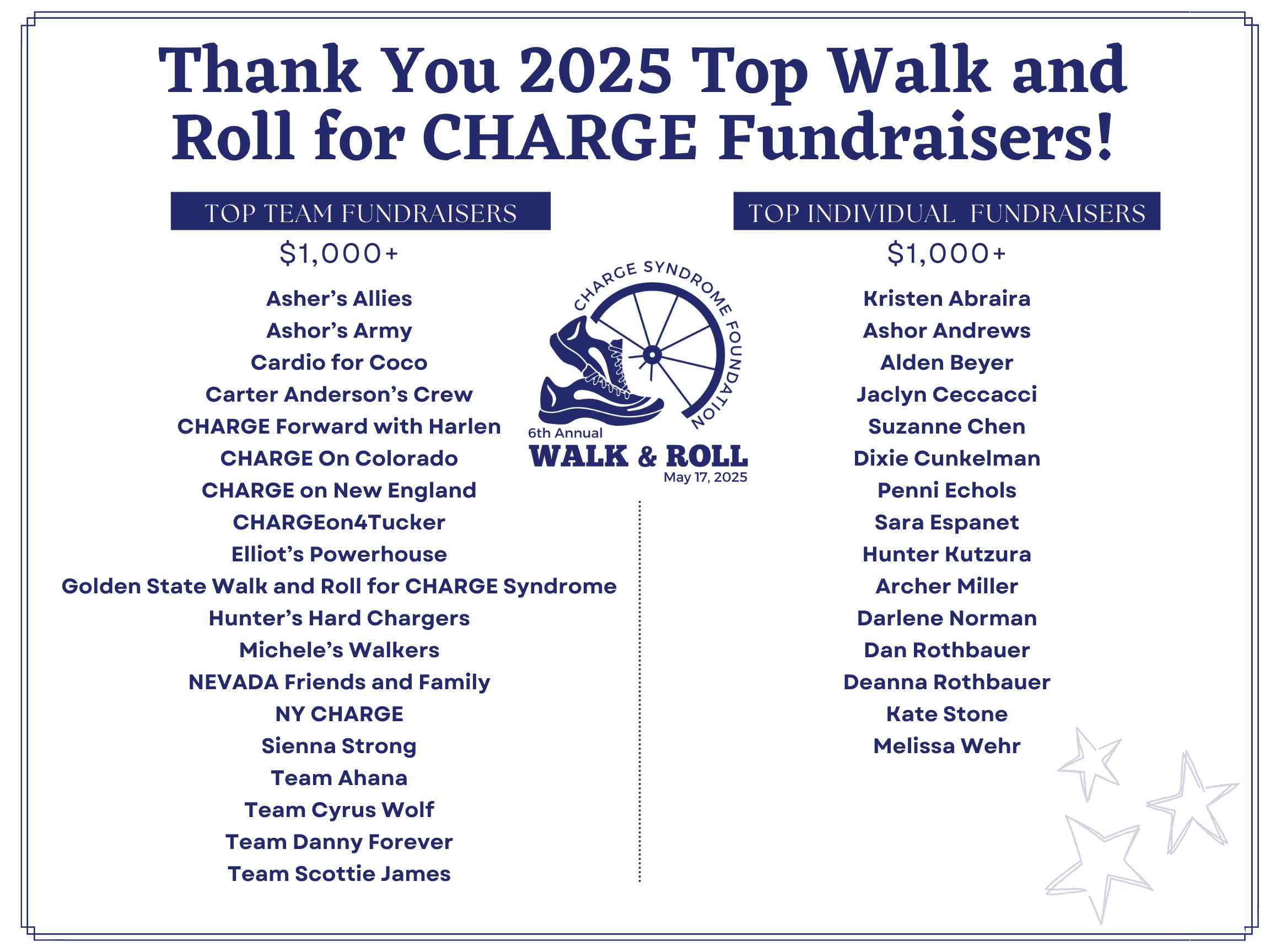 Below are the fundraisers recognized at our 2025 International CHARGE Syndrome Conference in Phoenix, AZ.