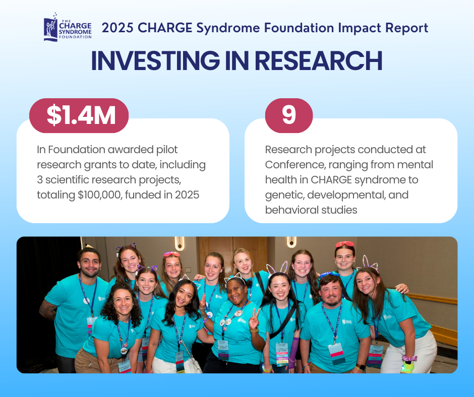 Across education, outreach, and research, our work has grown in both depth and reach. These accomplishments reflect our shared commitment to driving meaningful progress and building a world where every person with CHARGE syndrome has the opportunity to thrive.