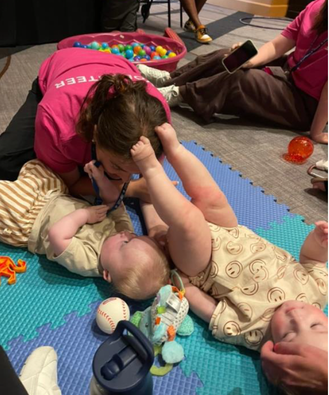 Another highlight of my experience at this year’s CHARGE Conference was returning to camp. I have been volunteering at camp since 2019, and it is one of the (admittedly many) best parts of attending the conference. My favorite part of camp is the sensory room, which is a low-light, quiet space where individuals of all ages can hangout and decompress. While in the sensory room at this year’s conference, I met Leo (on the left) and Tillman (on the right), who are one-year-olds with CHARGE syndrome.